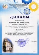 22.03.2023 10:52 Аспирант кафедры "Приборостроение" Урваев Илья принял участие в IХ Всероссийской научно-технической конференции для молодых ученых и студентов с международным участием «Инновации технических решений в машиностроении и транспорте»